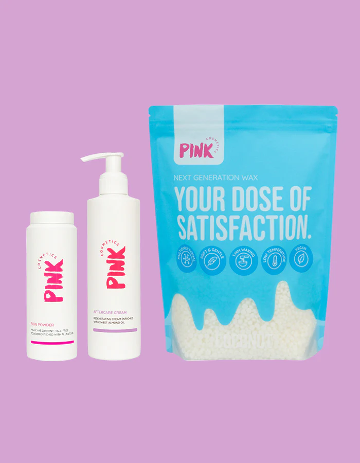 PINK Waxing Mini-paketti sisältää sen mitä tarvitset täydellisiin vahaustuloksiin. Setti on suunniteltu erityisesti herkälle iholle ja sisältää 100 % vegaanisia tuotteita.